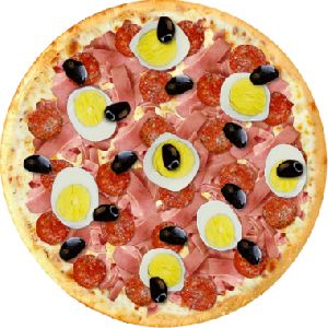Azeitona preta, Calabresa, Cebola, Molho de tomate, Mussarela, Ovo