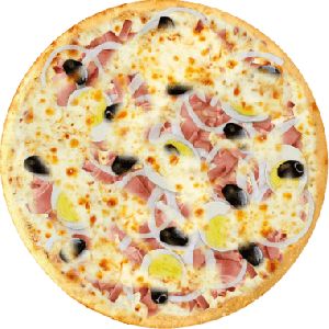 Azeitona preta, Cebola, Molho de tomate, Mussarela, Orégano, Ovo, Presunto